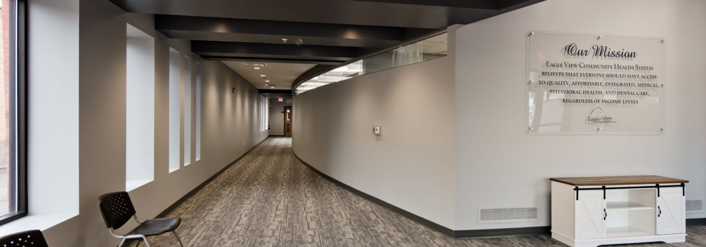 Our team at Bush Construction worked with IDEA Architecture and remodeled an old theater into a healthcare facility for Eagle View Community Health. This health clinic is a full-service health center offering medical, dental, behavioral heath, and substance use services. To provide this range of treatments the building includes exam rooms, dental hygiene stations, counsel offices, and includes an in-house medical lab.
