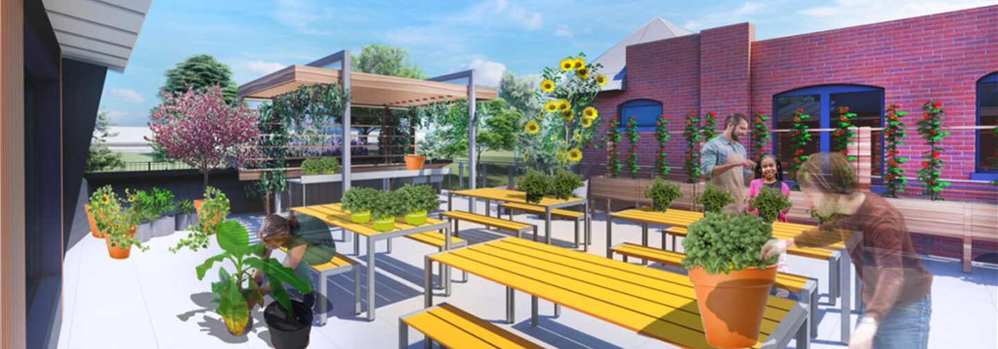 A state-of-the-art greenhouse with aquaponics, vertical farming, and rooftop rain gardens