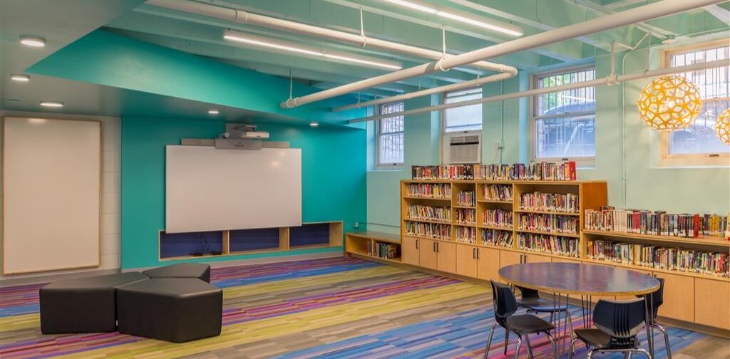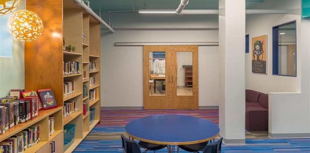 We worked with the staff and the students to program the space and developed a detailed plan to add a science lab, a maker space, and a library that would open up to the cafeteria. We installed and operable glass wall between the library and cafeteria, adding flexibility to both spaces and bringing more light into the cafeteria space. The finishes are colorful and cheerful and the furniture varies from standard tables and chairs to lounges and beanbags, providing an atmosphere that feels somewhere between a cool “start-up” and a school.