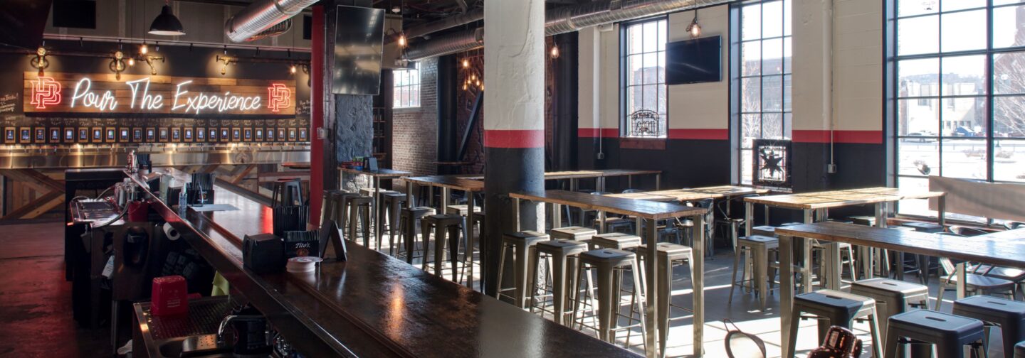 The interior of the new craft taproom features a rustic industrial design that pays tribute to the area’s hard-working heritage who built this vibrant community.