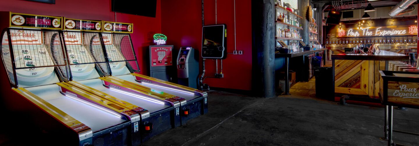 Our design team did an excellent job of creating an eclectic combination of concrete floors, metal, wood, tile, and artwork blend together to create an inviting and relaxed space. The large room is a mixed-use area consisting of vintage games and some TVs – a great space for groups, parties, league game nights, trivia, or just a fun place to hang out with friends.