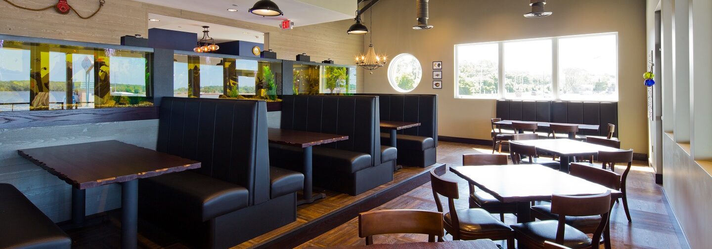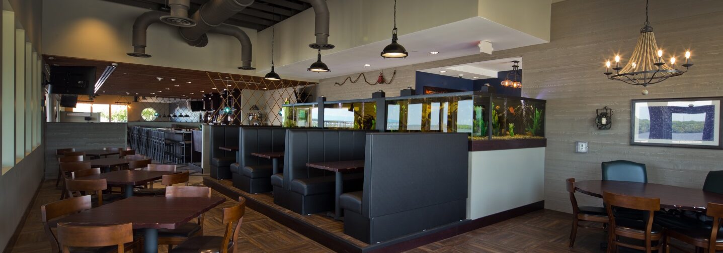 Bush Construction also installed two complex door systems called Win-Dor folding doors. These door systems lead to the large dining patio. On the exterior of the building, we installed fiber cement siding, metal fascia, metal soffit, a flat TPO roof, and a shingled roof. The indoor dining areas consist of LVT floors, painted walls, and painted wood siding and exposed ceilings with painted duct.