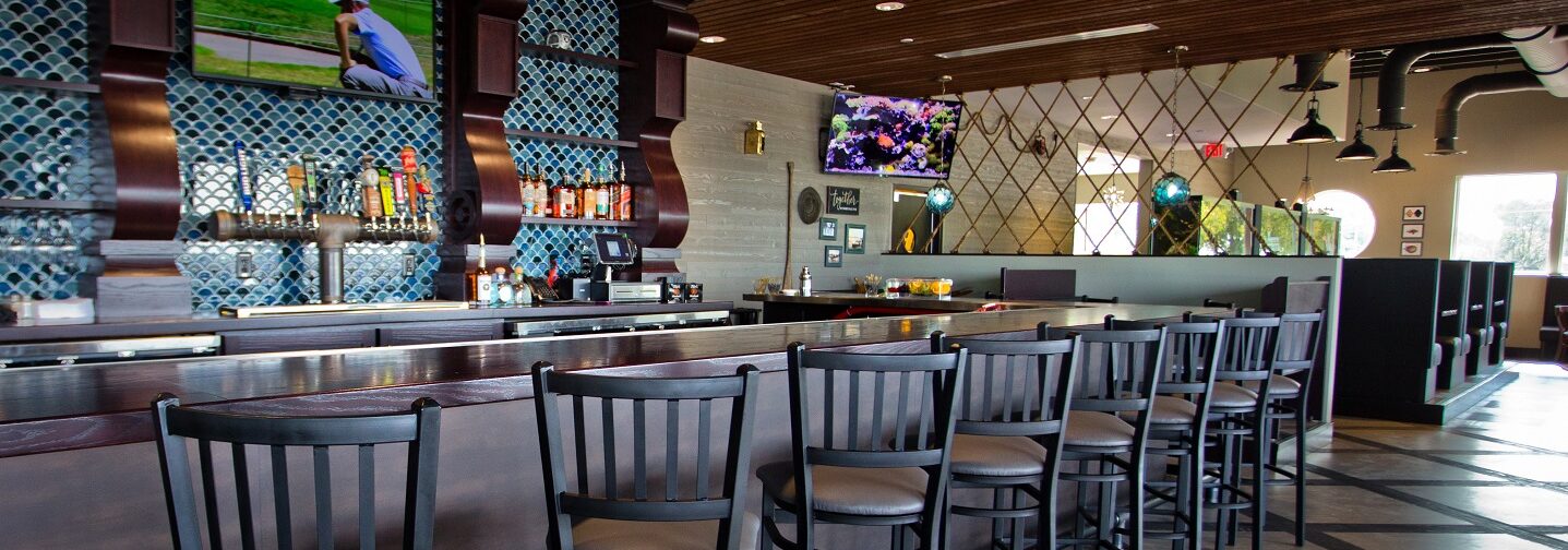 The main entry has a storefront vestibule/waiting area with a custom hostess stand. The bar also includes custom waiter stations, bar top, and shelving for behind the bar. To complete the bar area, Bush Construction installed painted wood siding and cedar wood ceilings.
